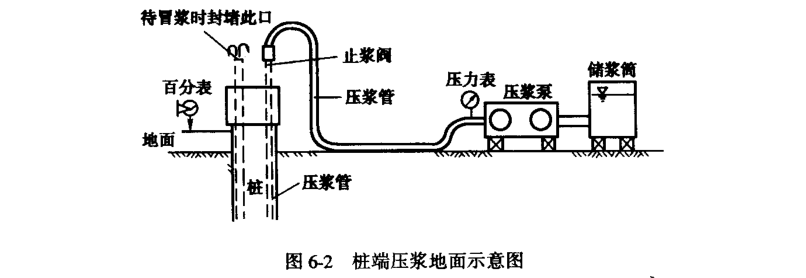 灌注桩后压浆借助于事先安设于桩身内的构件进行压浆以达到加固目的,或者通过桩端与地基间的界面或沉渣进行压浆以使桩身有效地将荷载传递到持力层上,或者通过对地基“后灌浆”以达到桩基加固目的。另外,还可对桩身缺损部位进行修补。