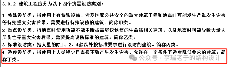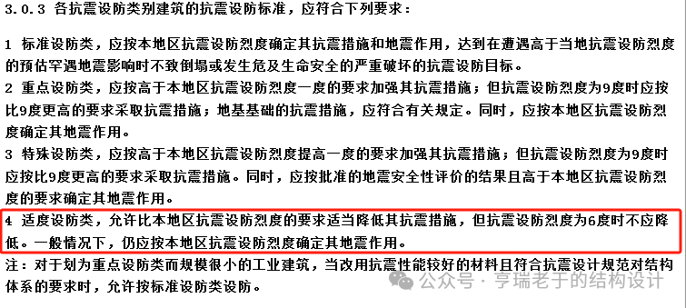 注意的是适度设防类,即丁类,一般情况下,仍应按本地区抗震设防烈度确定其地震作用。