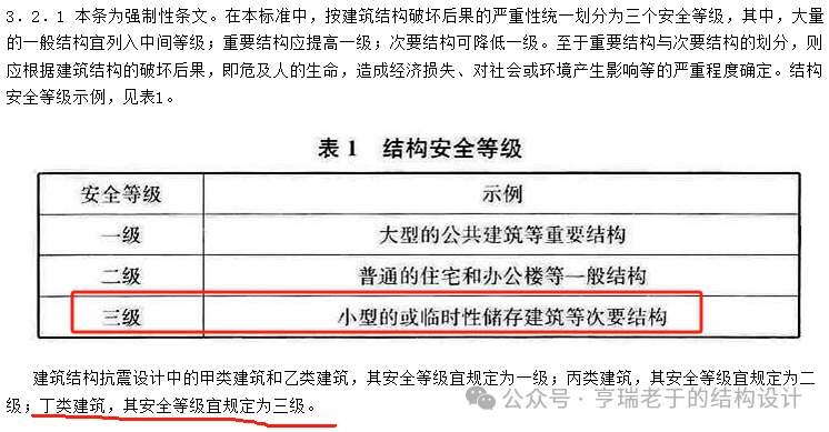 我们再看《建筑结构可靠性设计统一标准》GB50068-2018第3.2.1条及条文说明对建筑结构的安全等级的规定,丁类建筑的结构安全等级宜为三级,并不是说结构安全等级三级的建筑是丁类建筑,也可以是临时建筑,规范及条文说明截图如下: