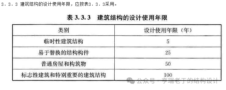不同建筑的设计使用年限可参照《建筑结构可靠性设计统一标准》GB50068-2018表3.3.3: