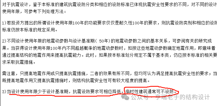 在实际工程中,我个人建议适当提高临时性建筑结构的安全度,按丁类设防标准。具体应用大家可以根据工程实际条件自行把握。