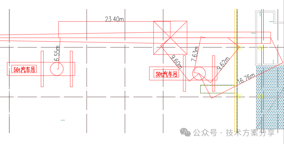 现场1#塔吊安装时,根据现场实际情况,使用50吨汽车吊进行安装,每个支腿下垫2000mm*2000mm*20mm的钢板,单支腿的接触面积按照2000mm*2000mm=4m2的受力面进行考虑。