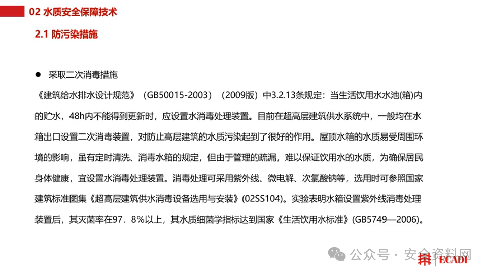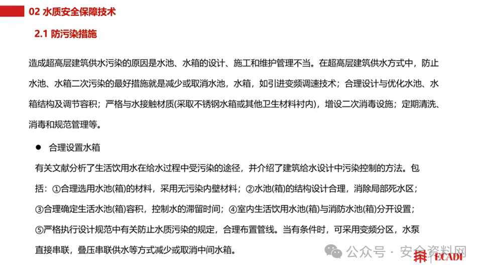 采用无污染的内壁材料,对于它这个结构消除这个死水渠,通过设计来消除死死水渠,要合理的确定这个水池的容积,控制水的滞留时间不希望我们过多的水停留时间过长。那么对于室内的饮用水的水箱和消防水箱,必须要分开设置。然后严格的执行规范中关于水质污染的规定,合理的布置管线。当有条件的时候,可以采用变频来避免设置水箱。