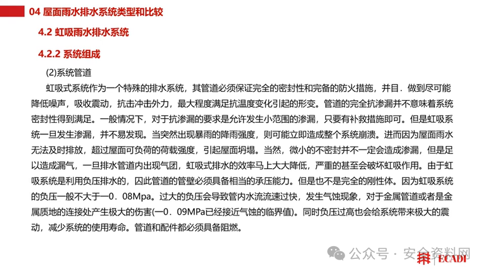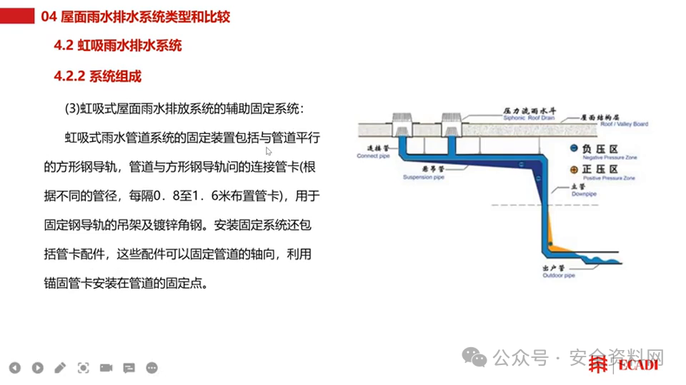 第三,虹吸式屋面雨水系统的辅助固定系统。红心是雨水系统的固定装置,包括与管道平行的方形钢导轨,管道与方形钢导轨之间的连接管卡,根据不同的管径可以每隔0到0.8到1.6米进行布置关卡,用于固定这个钢导轨的吊架以及镀锌钢的角钢。安装固定系统还包括了管卡配件,这些配件可以固定管道的轴向,利用这个锚固管卡安装在我们管道的固定点处。