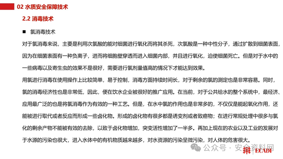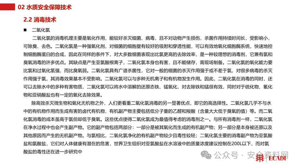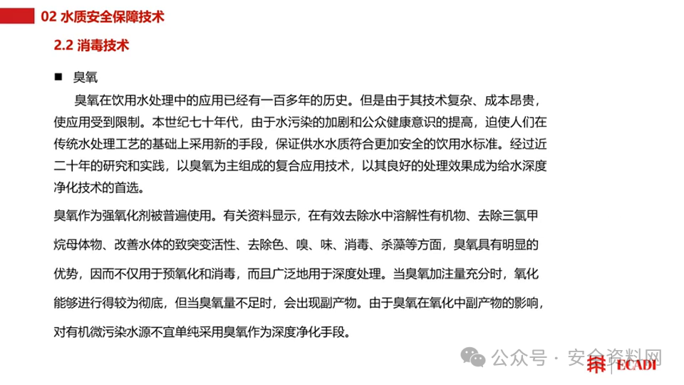 臭氧是一个目前也是非常常见的一个消毒方式,有关资料的显示,它用于去除水中的有溶解性的有机物,去除三氯甲烷的母体物质,能够改善的水体的致突变性,而且包括很非常有效的去除色嗅味等各个方面,它具有一个非常大的一个优势。但是它也有一个缺点,就是当如果臭氧量不足的时候,它依然会产生一些消毒的副产物。人们又开始转向二氧化氯消毒。二氧化氯的机消毒机理基本上和刚才提到的律是差不多的。它也是通过它的一个强氧化性,能够进行一个杀菌作用。它除了高效的杀灭微生物和氧化有无机物以外,还我们人类人们更高更看重它的是另外一个高选择性。它几乎不与水中的有机物作用,还产生有害的这枚刚才提到的有害的一个小的副产物。因此我们也是目前是逐步一直在推广采用这个二氧化氯消毒的这么一个措施。