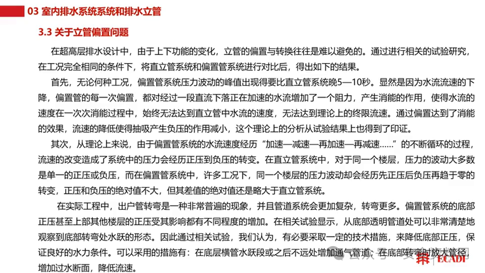 下面我来介绍一下立管的偏置问题。在超高层排水设计当中,由于上下功能的变化,立管的偏置和转换往往是难以避免的。通过相关的实验研究,在工况完全相同的情况下,将直立管的系统和偏置管的管系进行对比后,可以得出如下的结果。首先无论何种工况,偏置管系统的压力波动的峰值会出现在比直立管系统一般是晚5到10秒,显然是因为水流流速的下降,偏置管的每一次偏置都会对于经过一段的直流下落并且正在加速的水流增提供了一个阻力,从而产生了消能作用,使得水流的速度在一次次消能过程中,始终无法达到直立管中的水流速度,也无法达到理论上的中线流速。对于偏置达到了消能效果,流速的降低使得抽吸产生的负压作用减小。这个理论上的分析通过实验也得到了印证。