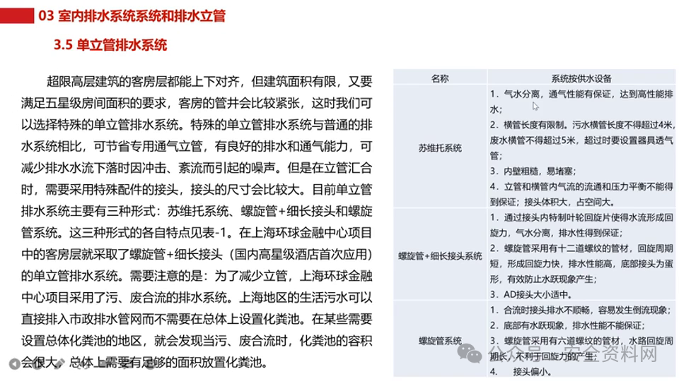 目前单独的排水系统主要有下面三种形式,苏维托螺旋管加细长接头以及螺旋管系统。这三种系统的各自特点,我们列了一张表,大家可以看一下,在一些比较有典型的案例。比如说上海环球金融中心的项目中,客房就采用了这个螺旋管加细长接头的这么一个单立管的排水系统。