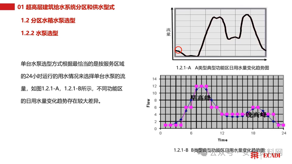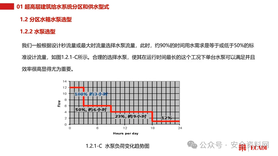 下面是水泵的选型,在这边我们列列出了两种不同类型的典型建筑的一个用水量的一个变化图。单台水泵的选型一般是要根据最恰当的是按照服务区域24小时的运行情况来进行选择。但是这样的话,对于不同的典型的建筑来说,它的区别也是比较大的。我们一般目前的设计,从设计角度来说,我们根据设计秒流量的最设计秒流量或者是最大时的用用水量流量来选择水泵。此时约90%的时间用水需求是等于或低于50%的标准设计流量的。如2.1点C这张图所示,这是一个水泵的符合变化的一个趋势图。合理的选择水泵,使其在运行时间内最长的这个工况下的单台水泵可以满足,并且处于效率最高的这个区域,是我们选择水泵的一个关键点。