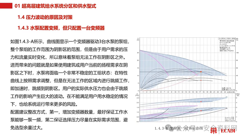 第三,关于水泵配置的变频,但只配置一台变频器。那么这个4.3点A是这张图,是变频器一对多的这么一个示意图。这个曲线显示的是一台变频器驱动三台水泵的泵组,整个泵组的这这这个工作范围就是阴影范围。但是由于这个用户需求的压力和流量是实时变化的,所以意味着这个分组无法在工作在这个阴影区之外。进而带来的问题就是如果使用这个建筑或者用户在当前的扬尘需求在阴影区之下的时候,水分就将面临一个非常不稳定的一个工作状态。那么在这个特性曲线上按照需求的调整,但是又无法在这个工作区域内进行跳频工作,即在加速的时候就要跳频到这个阴影区这个工作区内。那么用户的实际的供水压力也会由于跳频工作的影响产生巨大的波动,从而影响它的一个舒适性,也给系统的运行安全性,阴阳性的稳定带来更多的风险。