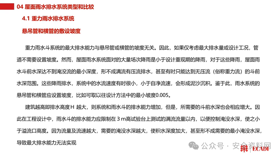 然而屋面雨水系统的面对大量场次的降雨,是小于设计重现期的降雨。对于这些降雨,屋面的雨水斗前水深是达不到淹没流的最小深度的,形不成满满管压力流的这么一个排水,甚至有时候只能达到无压流,俗称这个重力流的抖潜水深的一个范围。这些降水的排水系统的水流的速度有时很小,小于自净流速,会形成泥沙的沉积。有鉴于此,雨水系统中的悬吊管以及横管应该设置坡度。比如说可取这个设计,按照最小的一个零点5‰来进行考虑。那么建筑越高及排水高度这个H越大,则系统和雨水斗的排水能力增加,但是所需要的斗前水深也会相应的增加。因此在工程设计中,雨水斗的排水能力应限制在3米高的试验台上的测试的满管流的范围以内,以便控制与淹没水深,使之小于溢流口的高度。因为流量和流速越大,需要的淹没水深越大,使得积水深度加大,甚至形不成所需要的最少淹没水深,导致这个最大排水能力无法得以实现。