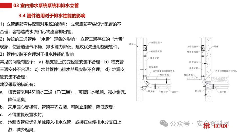第三,管件安装不合理对于排水性能的影响,常见的问题主要有这个排水管支管上面横支管的变径安装不合理,横直管上的三通安装不合理,水分管件与排水器具安装不合理,地漏支管安装不合理。那么针对于这四个问题,常用的措施主要有,对于横支管上面采用45度顺水三通,可使得排水畅畅顺,减少导流,降低反臭。第二,采用偏心变径管管顶拼接,可防止导流,降低反臭,不得重复安装水封地漏。支管上应优先单独接入排水支管,排水支力排水立管或者接在坐便器的分支管上,分支管的上游减少范畴。