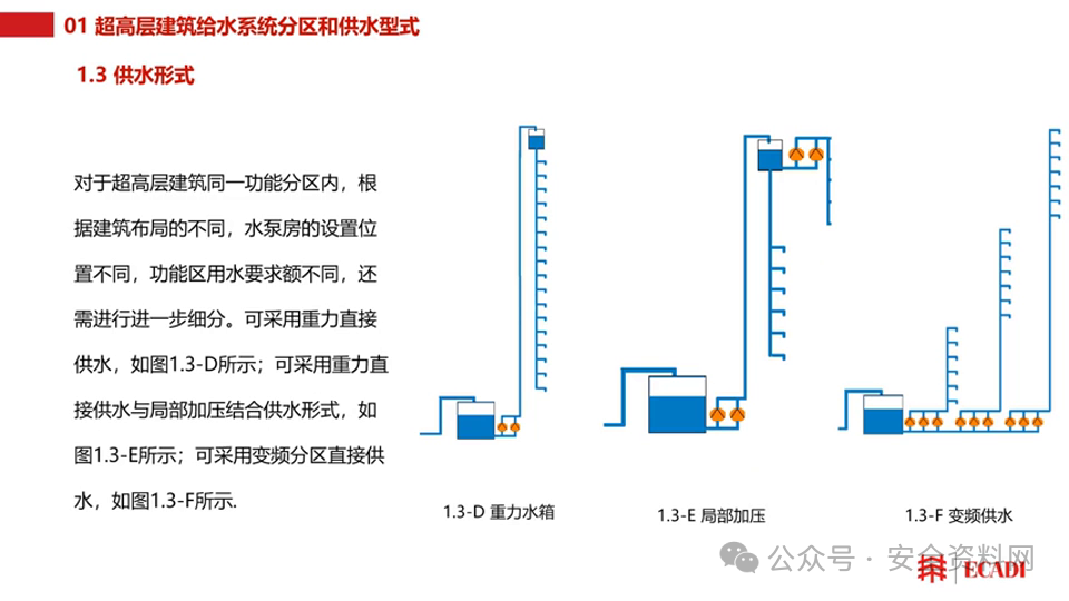 所以在某些在某些项目中,也是为了安全起见,也可以采用水箱供水泵分区供水的这个方式。如C图所示,此时水箱的有效容积应同时考虑水箱供水部分的调节容积。另外对于超高层建筑,同一功能区分区内,可以根据建筑的布局不同,水泵房设置的位置不同,功能区用水要求额度不同,还要进行一步进一步的细分。也可以可以采用一些重力的供水方式,比如地图所示,也可以采用重力直供供水与局部加压结合的一个供水方式,如图一所示。也可以采用也可以采用一些变频分区的直接供水,比如F图所示。