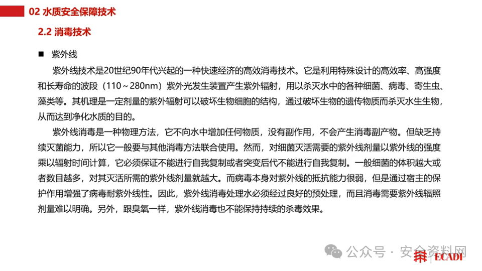 下面是紫外线,紫外线是我们常规的建筑的消毒的一个非常常见的一个方式。它的一个作用机理,它是通过这个特殊的设计特殊设计的一个高效率高强度的一个波段,紫外光波段的进行一个辐射的消杀毒。那么对于它的它是一种物理的方式,它不像水中增加任何添加任何物质,因此它没有副作用,它不会产生所谓的消毒副产物。但是他最大的缺点是缺乏持续的灭绝能力。所以,一般来说他需要与其他的一个消毒方式进行联合配合使用,所以我们又目前又推出了一个新的一个消毒方式,就是微电解的一个消毒方式。对于超高层这个隔离水箱之后,安装微电解的这个消毒设备,也是逐步在推广。