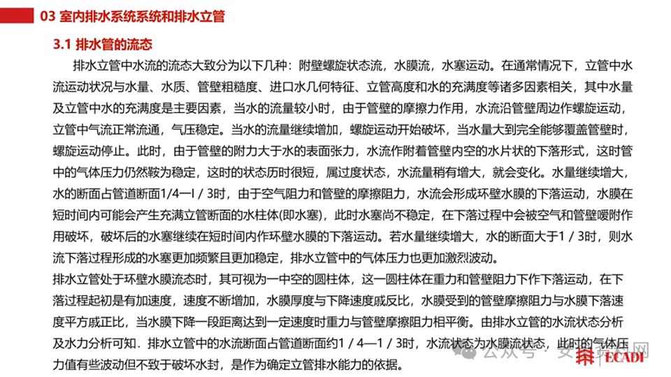 因此,它的目前是有很好的一个推广前景。好,下面我们进行第三部分室内排水系统的介绍,以及排水立管的这么相关的一个分析。对于这个排水,我们可以先看一下它的一个流态。对于排水立管中的流态大致可分为以下几种,一种是叫付壁螺旋流水膜瘤和水塞流。在通常情况下,地管中的水流的状况与水量、水质、管壁的粗糙程度、进水的几何特征、立管高度和水的充满度等诸多因素相关。其中水量及水管以及利管中的中利管中水的这个充满度是主要的因素。