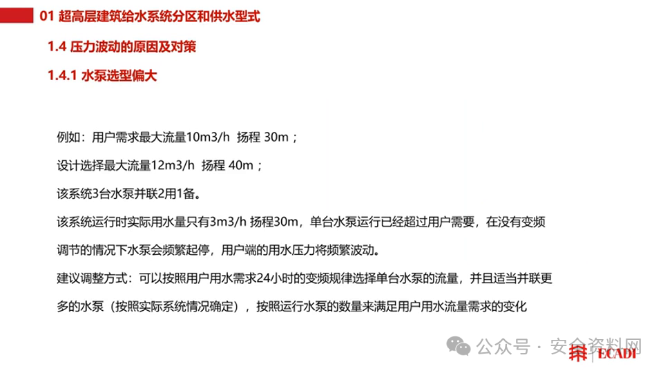 我们下面来谈一谈这个压力波动的原因以及对策。首先就是一个水泵选型偏大的问题。我们举个例子,比如说用户需求最大的水量是十吨每小时,扬程30米。设计选择的最大流量是12吨每小时扬程40米。该系统采用了3台水泵并联两用一备的一个方式。该系统的运行时实际用水量只有三吨,每小时扬程30米。那么单台水泵的运行已经超过了用水的需要,在没有变频调节的情况下,水泵会频繁启停,用户端的用水压力也将频繁波动,这样的用水舒适性是大大下降。建议调整方式是可以按照用户用水需求的24小时的变频这个规律来选择单台水泵的流量,并且适当的并联更多的水分,按照实际的实实际的系统的情况来进行加以确定。并且运行水泵的数量选择是要满足用户用水的流量需求的变化。