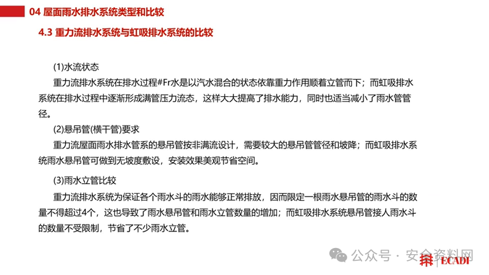 下面我介绍一下重力流排水系统与虹吸排水系统的比较。首先从流态来说,重力流排水系统在排水过程中它的这个是以汽水混合的状态,依靠重力作用顺着力管而下的。而虹吸排水系统在排水过程中逐渐形成了满管压力的流流态,从而大大提高了排水能力,同时也适当减小了雨水排水的环境。
