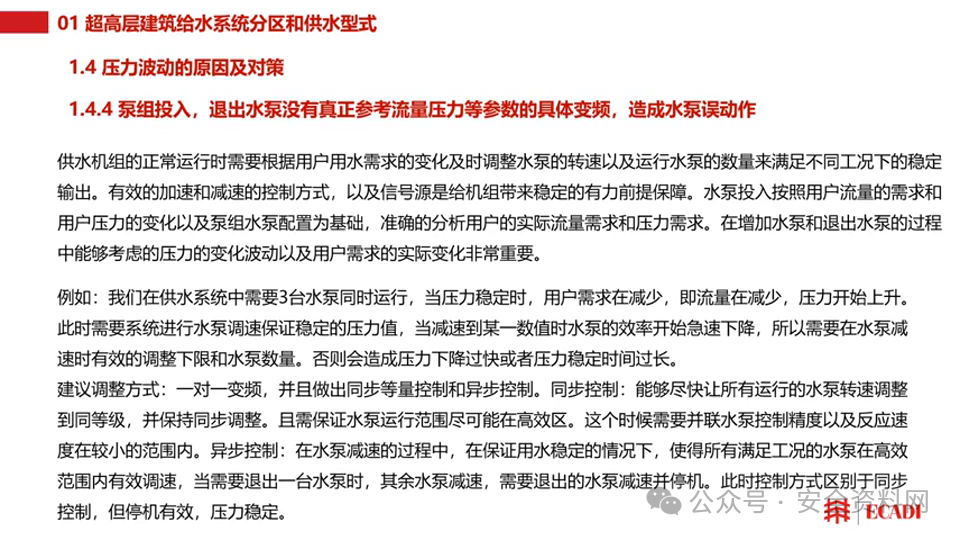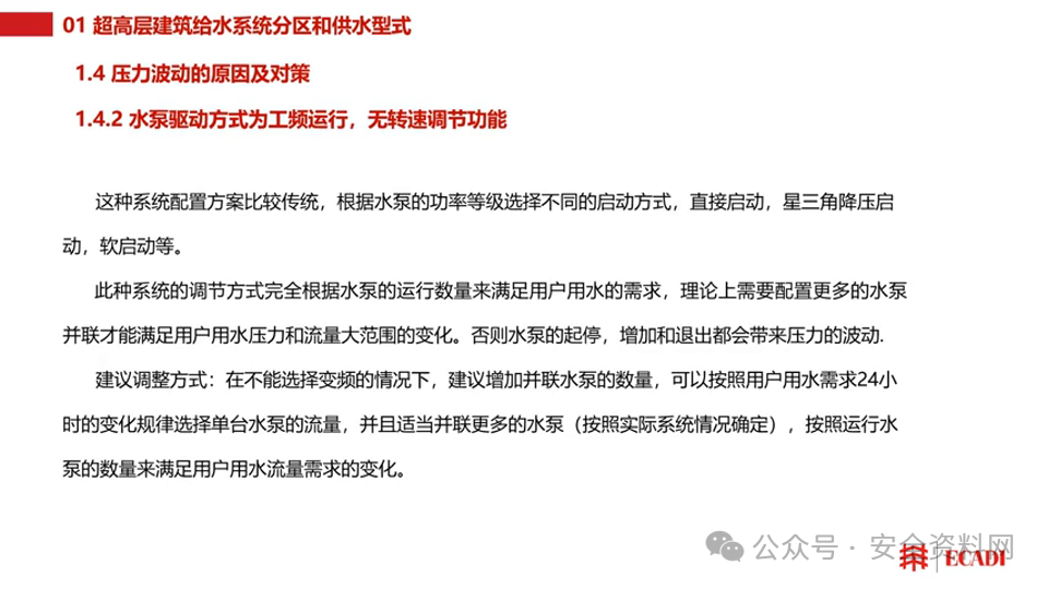 第二,关于这个水泵驱动方式为公平运行,无转述条件功能的时候,对于这种工况也是比较传统的。根据水泵的功率的等级选择不同的启动方式。比如说直接启动新三角降压启动,还有软启动等等。这种系统的调节方式,完全依据水分的运行数量来满足用户用水的需求。从理论上需要配置更多的水分并联,才能满足用户用水的时候的压力以及流量在大范围的变化。否则水泵的启停、增加和退出都会产生压力的波动,从而影响了用户的使用的舒适感。那么建议的调整方式,是在不能选择这个变频的工况下这个前提下,我们建议增加并联水分的数量。可以按照用户用水需求的24小时的变化规律来选择单台水泵的流量,并且适当的并联更多的水泵,按照运行的水泵数量来满足用户的用水流量变化的需求。