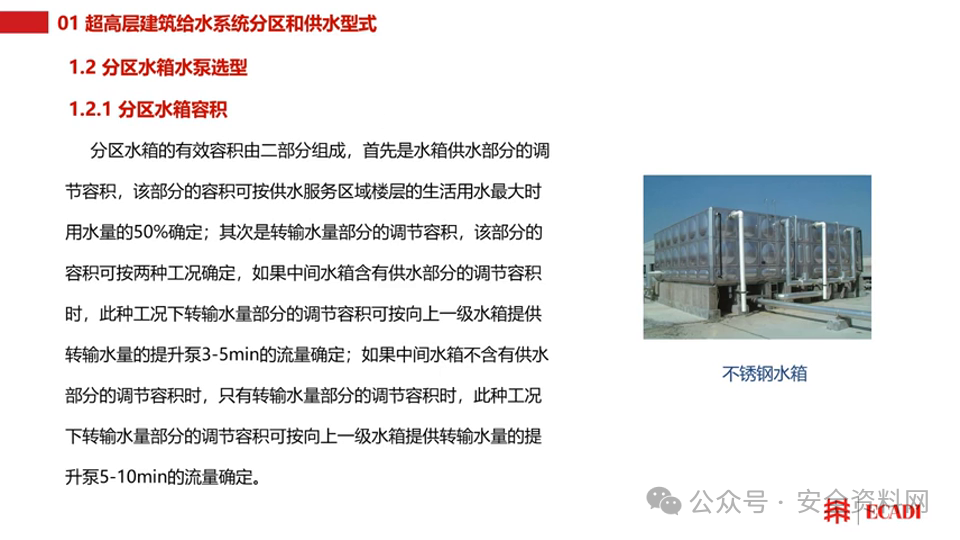 第二,关于分期水箱的一个水泵的选型。首先我来介绍一下关于水箱的一个容积分区。水箱的有效容积一般由两个部分组成。首先是水箱供水部分的调节容积,该部分的容积可由供水服务区域的楼层生活用水的最大时的用水量的50%来确定。其次是转输水量部分的调节容积,该部分的容积可由下面两种工况来确定。如果中间水箱还有供水部分的调节容积时,此种工况下的转输水箱的部分调节容积可按上一级水箱提供转输水量的传输水箱的提升泵的3到5分钟的流量来确定。如果中间水箱不含有供水部分的调节容积时,只有转输水量的部分来进行调节。在这种情况下,转出水量的部分调节容积可由上一级水箱的提供转出水量的提升泵的5到10分钟的流量来确定。