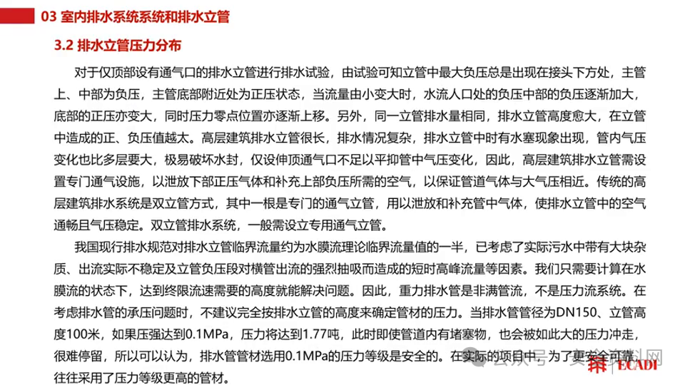 其次从理论上来说,由于偏置管系统的水流速度经历了加速、减速、再加速、再减速的这么一个不断循环的过程。流速的改变造成了系统中的压力会经历正压到负压的一个转变。在直立管的系统中,对于同一个楼层压力的波动,大多数单一的是单一的正压或者负压。而在那个偏置管系统中的许多情况下,同一个楼层的压力波动会经历先正压后负压,再趋于零的这么一个转变。正压和负压的绝对值不大,但其差值的绝对值还是要略大于直立管系统的。
