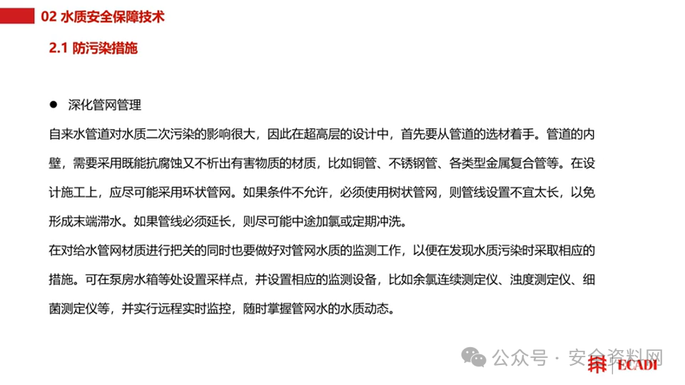 下面对于管网的自来水的管网,对于二次污染的影响也是非常大的。因此对于超高层建筑来说,它的管网的量也是对于比其他一些厂小建筑来说,它的量是也是不在一个等级的。所以我们首先要从管道的选材着手。这个管道的内壁需要采用既能抗腐蚀又能不吸出有害物质的材质,比如说铜管、不锈钢管以及各类的金属复合管等等。在设计施工上应尽可能采用环状管网。如果条件不允许,必须使用树状管网,则这个管线不宜设置的太长,以免形成末端的一个制水。如果管线必须延长,那么尽可能中间加一些处理的一个消毒的一个方式,并且进行一个定期的清洗。