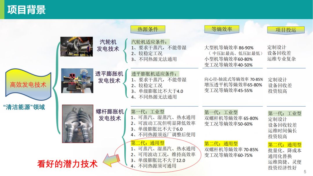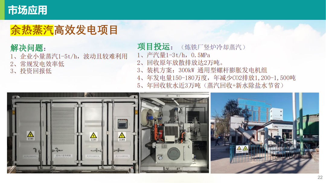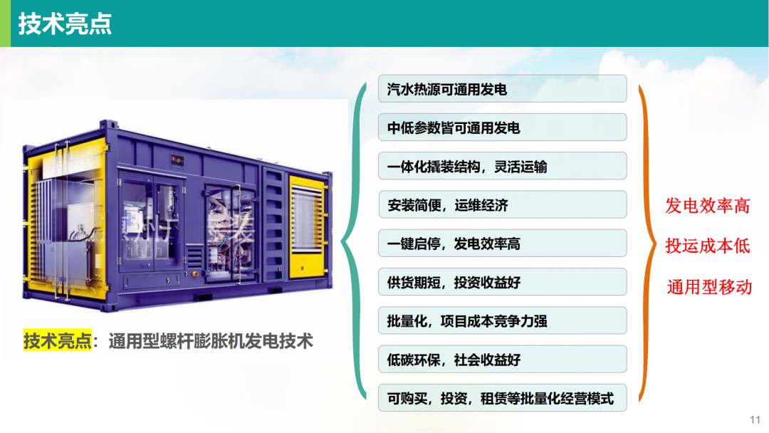钢铁、有色、水泥、玻璃、合成氨、烧碱、电石、黄磷、硫酸、石油化工等行业余热资源十分丰富,余热资源总量高达4亿吨标准煤,其中大量的低温余热资源未得到有效利用,低温余热发电前景十分广阔。新型螺杆膨胀高效热水发电技术是平台近年来重点支持转化推广的绿色低碳技术,通过平台的精准对接服务,目前已在湖南、广东、广西、江苏、山东等地启动了一批项目落地,技术得到客户和投资方的高度认可,该技术具有很多独特优点,平台特发布技术公告,面向全国大面积推广应用,相关技术具体内容如下: