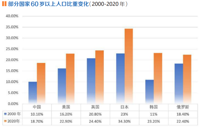 对比部分国家2000-2020年60岁以上老人年口比重变化,在美国、英国、日本、韩国、俄罗斯及中国七个国家中,中国、日本、韩国三个亚洲国家老龄化速度快于其他国家,在20年间比重分别增加8.6%、11.3%、12.2%。