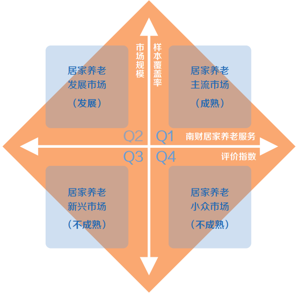 在低居家养老服务评价+低市场规模(样本覆盖率)的情况下,我们认为市场处于Q3象限,即居家养老新兴市场;在高居家养老服务评价+低市场规模(样本覆盖率)下,我们认为市场处于Q4象限,即居家养老小众市场,这两种市场都属于不成熟市场。