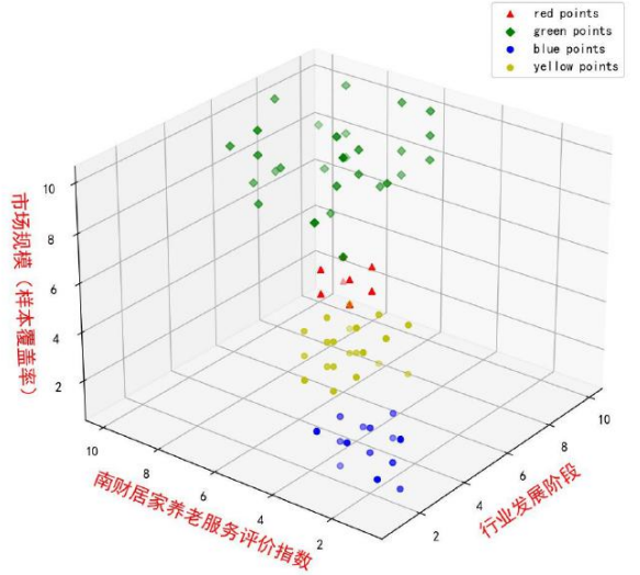 通过这一评价体系、市场规模(样本覆盖率)以及行业发展阶段(萌芽期、发展期、成熟期)三个维度,可构建行业发展三维坐标系。更直观地分析行业整体发展情况。同时使用这一评价体系辅以调研样本中居家养老服务的覆盖率,可以推测出居家养老市场发展阶段。“南财保险通·居家养老市场战略坐标体系”如下: