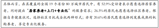 除去消费力提升及相关产业发展,近年来直接关系老年人生活的养老服务行业同样潜力无限。据《养老服务报告》,仍有近八成受访者在未来更倾向于选择熟悉且舒适的环境,在“家门口”实现居家及社区养老;同时,有两成受访者表示未来愿意接受机构养老,选择更专业的康养服务。