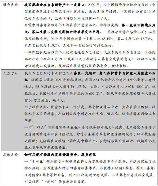尽管中央及各地政府已在积极探索因地制宜的养老新模式,但养老行业仍然在财力、人力以及其他三方面存在一定缺口。