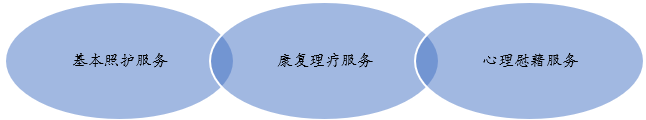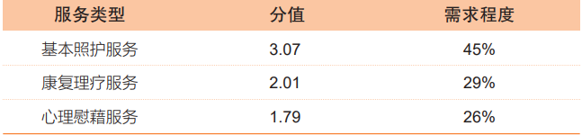 基础照护服务在调研中得分3.07分,康复理疗服务得分2.01分,心理慰藉服务得分1.79分,三者按比例得到基础照护服务的需求程度权重为45%,康复理疗服务的需求程度权重为29%,而心理慰藉服务的为26%。