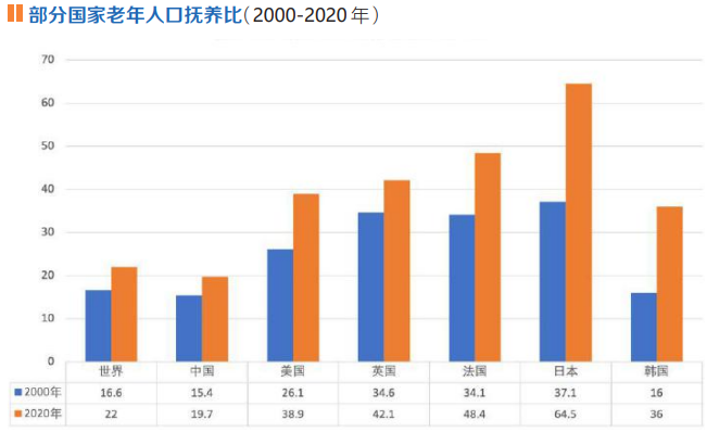 相较发达国家,尤其美国、英国、法国、日本等国家,中国当前老年抚养比较低;但据预测,2030—2050年,中国老年人口抚养比将升至40%~50% ,平均每2~3位年轻人将赡养一位老人。