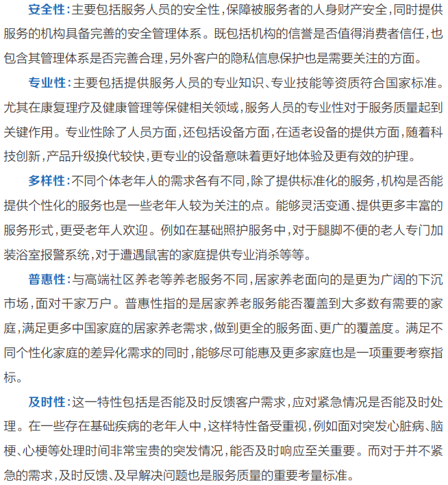 针对养老服务需要满足的特性,我们总结出五大特性,分别是专业性、多样性、普惠性、及时性以及安全性。