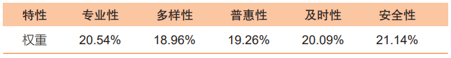 五个二级指标,即专业性、多样性、普惠性、及时性和安全性。其中专业性与安全性配以21%的权重;及时性配以20%的权重;多样性及普惠性分别配以19%的权重。