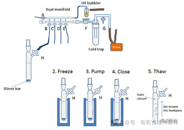 。将密封的Schlenk管中或者厚壁的密封试管浸入液氮中。当溶剂完全冷却后,打开活塞,对于对于瓶内抽真空2-3min(反应瓶依然浸入在液氮中)。关闭反应瓶,解冻直至溶剂完全融化。重复该过程,通常三次。最后一次过程中将体系内充满惰性气体。在Schlenk瓶中去除氧气的溶剂通常能保存1-2天。