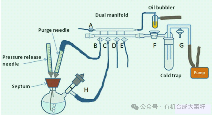 9) 第三次循环后再通过Schlenk line填充入惰性气氛。之前提过的,缓慢打开阀门B和H接通惰性气管以免让外部大气抽入Schlenkline。