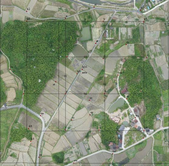如上图:确定航拍空域后,利用影像图、电子地图来确定像控点的大概位置和数量。上图中以K1/K5、K3/K7、K4/K8、K2/K6、K9/K10 (即测区要求的成果四角和中间位置)五个像控点来控制0.3平方公里左右区域。