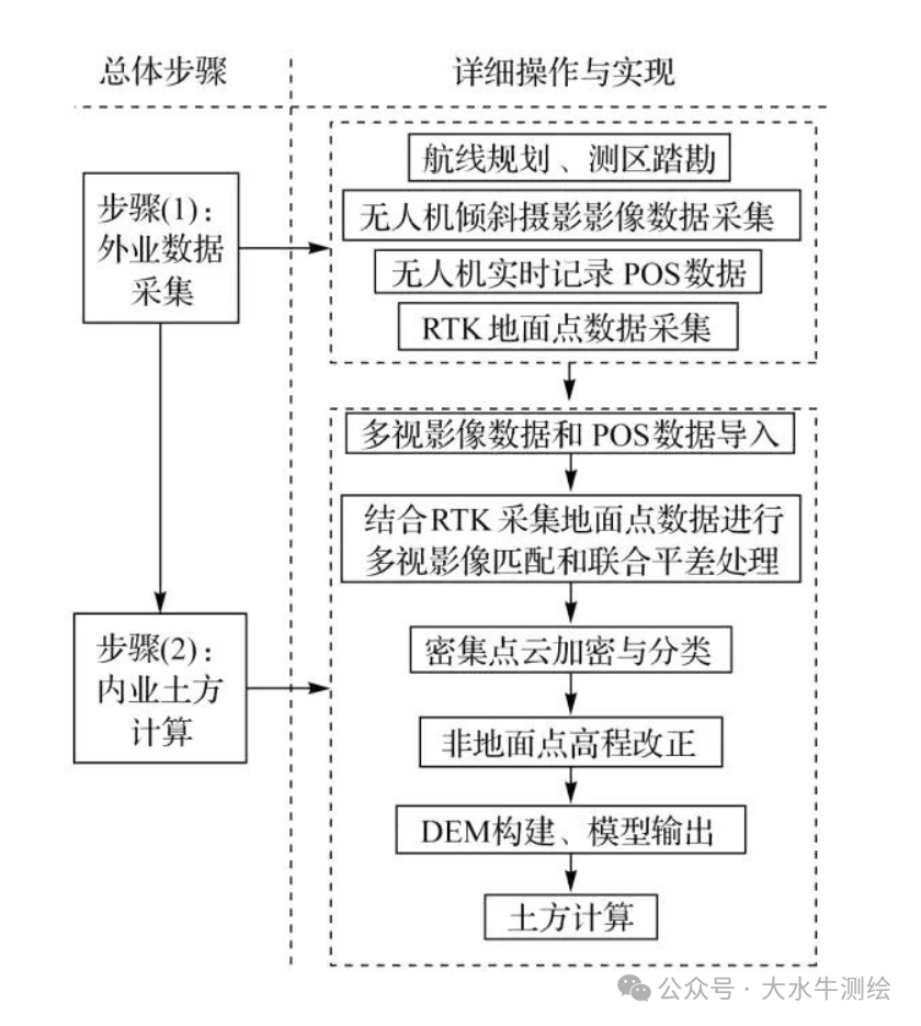 结合PhotoScan软件对测区边界外多余影像数据进行剔除,利用POS数据与地面控制点数据进行影像匹配和联合平差,生成稀疏点云数据。通过对稀疏点云进行点云加密得到密集点云数据,利用点云分类方式细化出地面点和非地面点,并基于高程改进方法进行非地面点高程改正,联合改正后的地面点和非地面点构建数字高程模型(DEM),最后通过导入测区和设计标高进行土方计算。