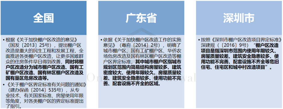 现从国家、广东省及深圳市三个层级对棚户区改造概念梳理如下: