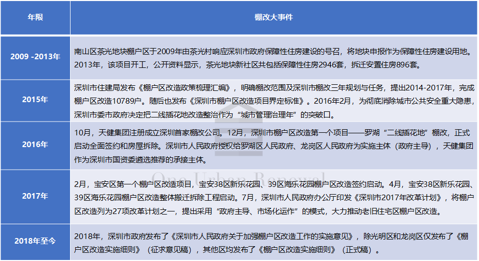 市政府为加快棚户区改造,于2018年5月出台《深圳市人民政府关于加强棚户区改造工作的实施意见》(深府规〔2018〕8号)。在此之后又出台了《深圳市棚户区改造项目专项规划审批操作规则(试行)》(深建规建〔2019〕4号),进一步对棚户区改造项目规划审批操作进行了明确。截止到2021年12月31日,各区均已出台棚改实施细则相关政策(除光明为征求意见稿,其余均为正式稿),对各区棚户区改造项目申报条件、改造意愿征集、签约比例、房屋征收及流程均作了明确规定,为各区棚改工作的大力推进提供了有力的政策保障。