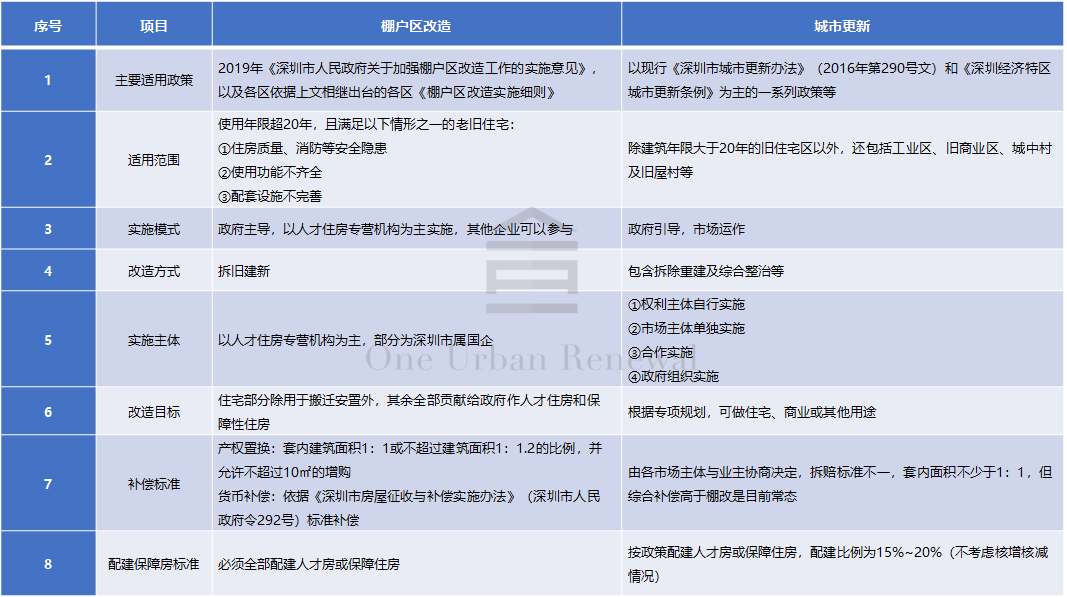 棚改与城市更新之间的区别除了适用范围、补偿奖励标准不同外,其最大的差异在于棚改是基于公共利益为目的,采取政府主导,以人才住房专营机构为主,其他企业可以参与的模式,搬迁安置住房以外的住宅部分全部用作人才住房和保障性住房,最大限度的保障公共利益。且在满足一定条件后,可依法实施房屋征收,因此棚改相比城市更新拆迁速度更快、整体流程周期更短。