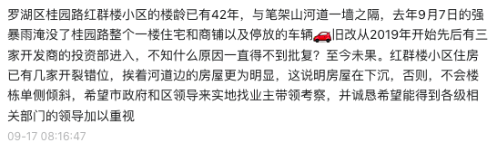 有网友在深圳乐居后台留言,罗湖桂园路红群楼小区超过40年楼龄,招北小区86年建设,至今已经38年……业主们都面临着墙体破裂、规划落后以及生活不便等问题。
