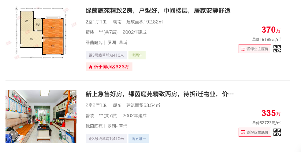 进入拆迁关键期,基本在网上已经很少有挂牌房源,仅在乐有家平台上有两套绿茵庭苑挂牌房源。