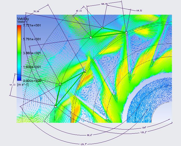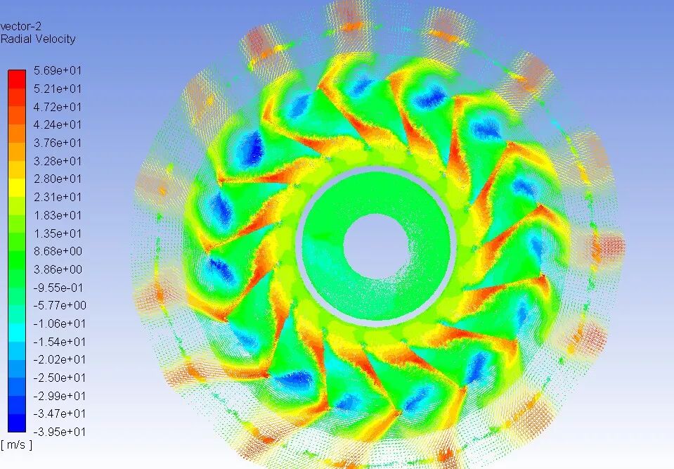 如下图所示,外径800mm离心风机顺指针旋转,转速1800rpm。从径向速度矢量图(radial velocity plot)中可以看出大量的空气自叶前表面区域排出旋转区域,但叶后的低压却将外部区域的部分气流倒吸回来,对风机的风量及效率产生非常不利的影响。虽然理论分析的逻辑是通过压力或压差来评估风量或风速的大小,但事实上空气的压力是由微观的粒子的定向运动及相互碰撞产生的。对于风扇的分析,可理解为叶片瞬时扫过的区域空气粒子极度稀薄,区域外侧稠密的空气粒子受到了不平衡的碰撞,被迫向极度稀薄区域流动,表观上形成了压力梯度。