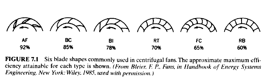 从离心风机的最大可达效率上,我们有如下结果:翼型叶片(airfoil blade)风机的最大可达效率约92%,但是翼型曲面的加工和制作非常复杂,尤其是考虑动平衡的要求,需要严格地控制叶片的形位公差,因此费用也最高。后倾弧形叶片(backward-curve blade)风机的最大可达效率约85%,弧形叶片的几何相对简单,制造费用中等。后倾直叶片(backward-inclined blade)风机的最大可达效率约78%,但突出的优点是制造成本远低于前两者,价格非常便宜,最常见的是重力铸造铝材风扇,广泛地应用于矿山机械、工程车辆、发电机、发动机组等。