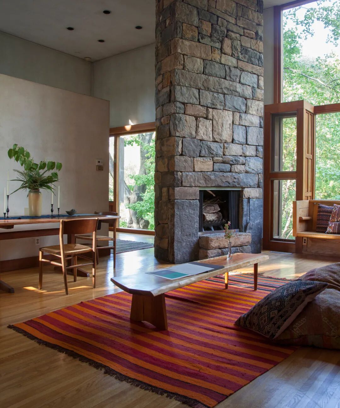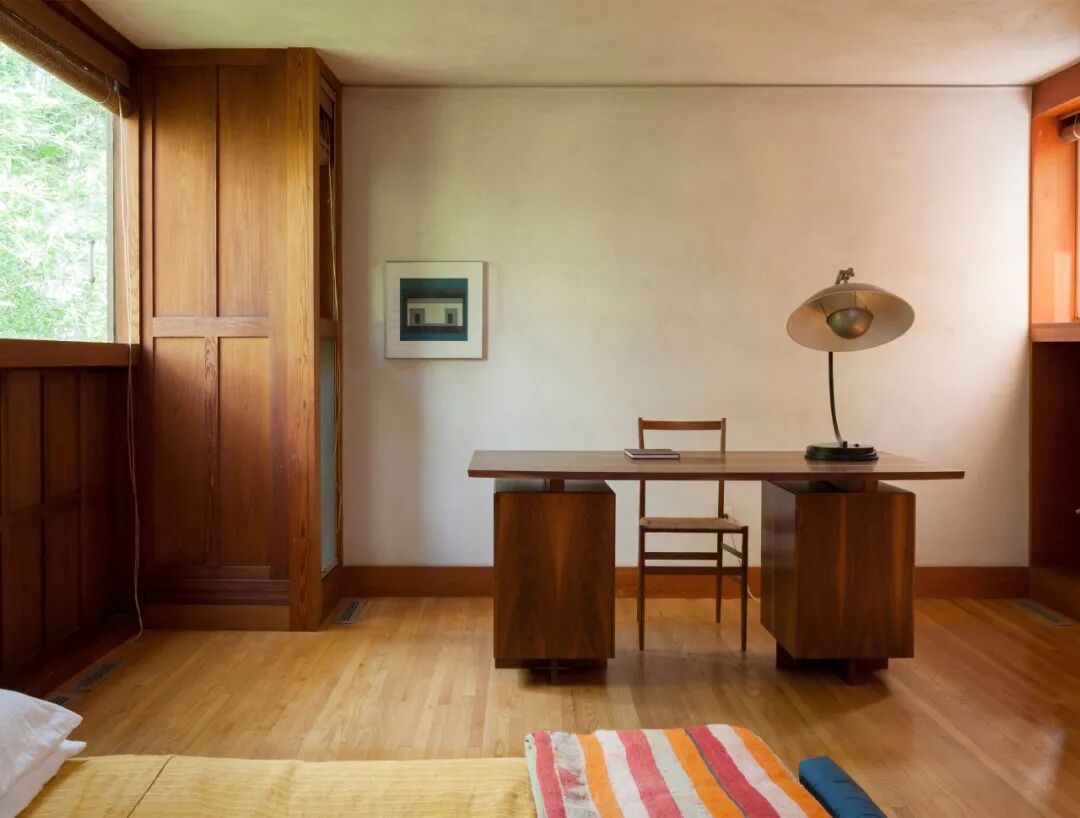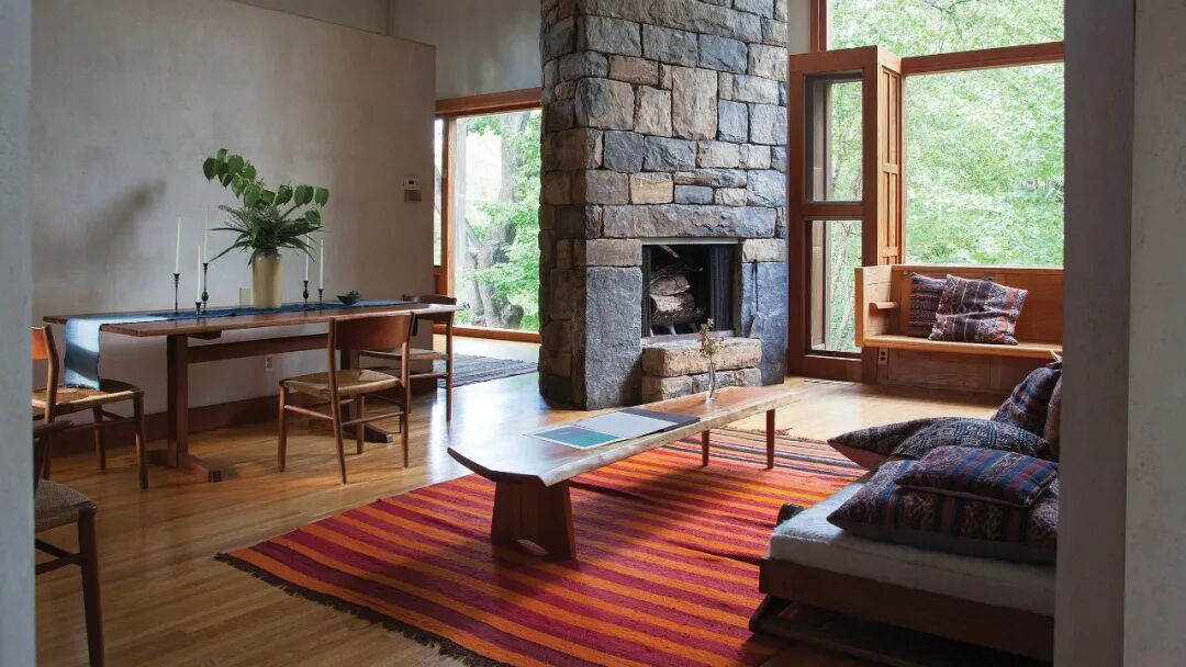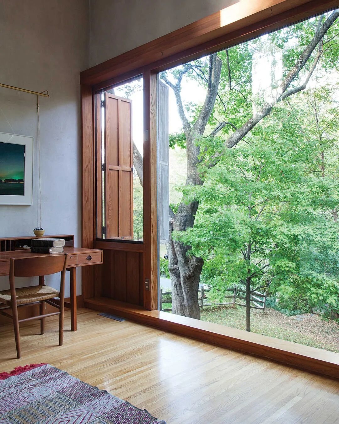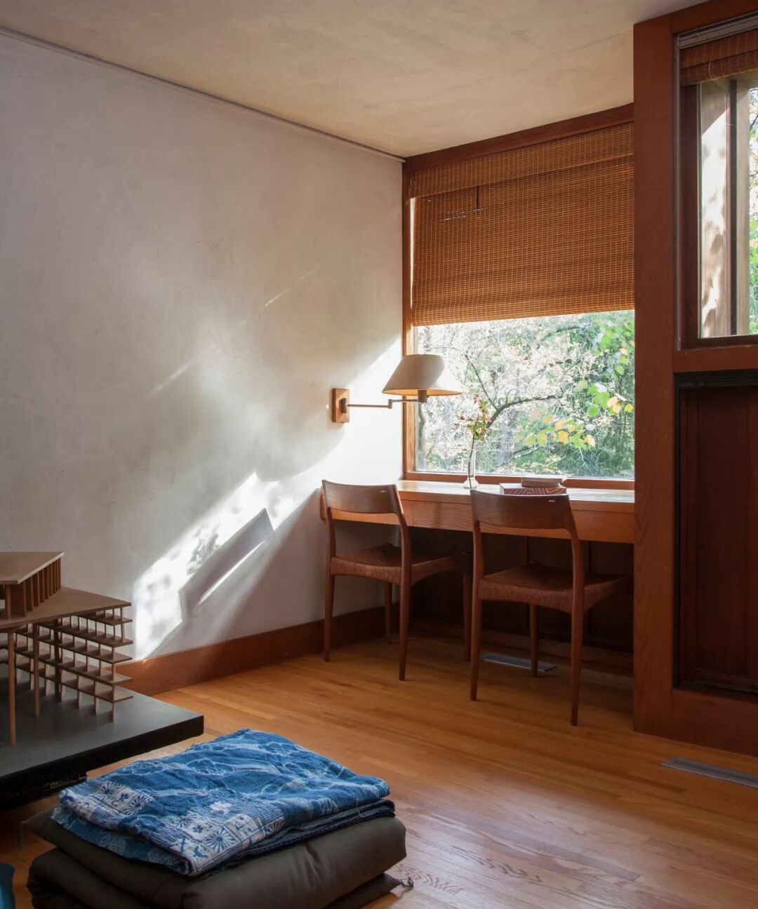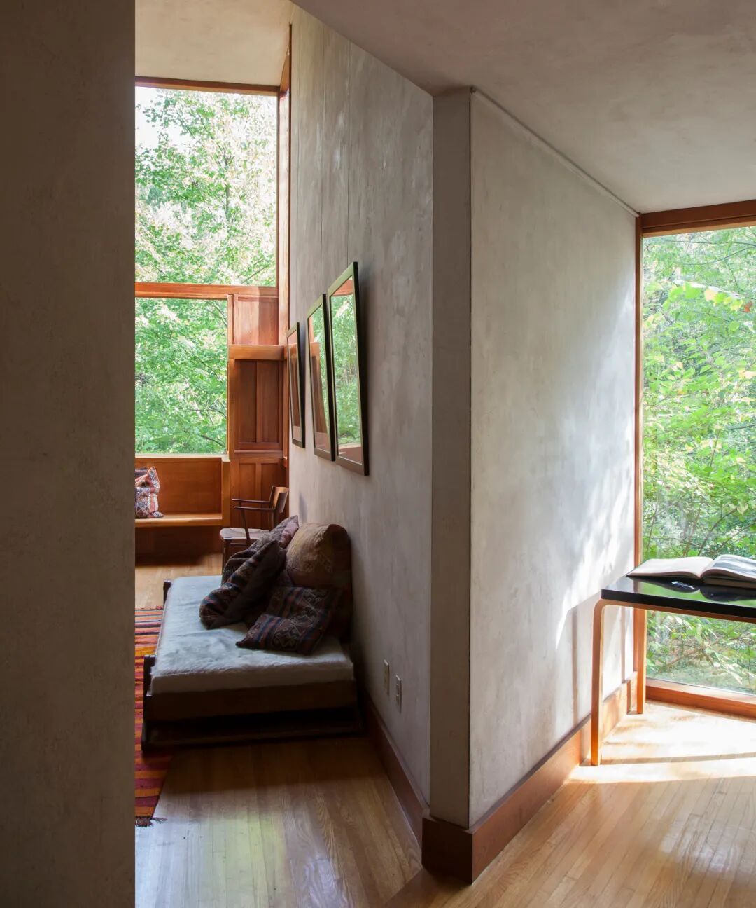 与路易斯·康以往的的混凝土或砖混建筑不同,费舍尔住宅无论是结构还是墙体都选择了木材作为主基调。在看到建筑的第一眼,就会被它那雪松木板建造的外墙所吸引,室内也延续了这种温暖的色调,在家具和装饰上与之相呼应,营造出舒适宜居的空间氛围。