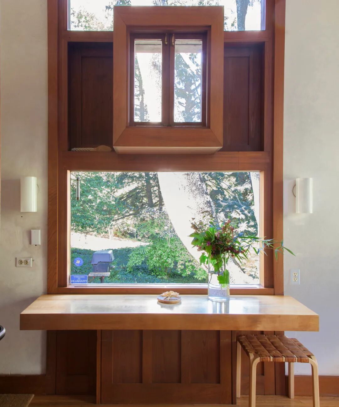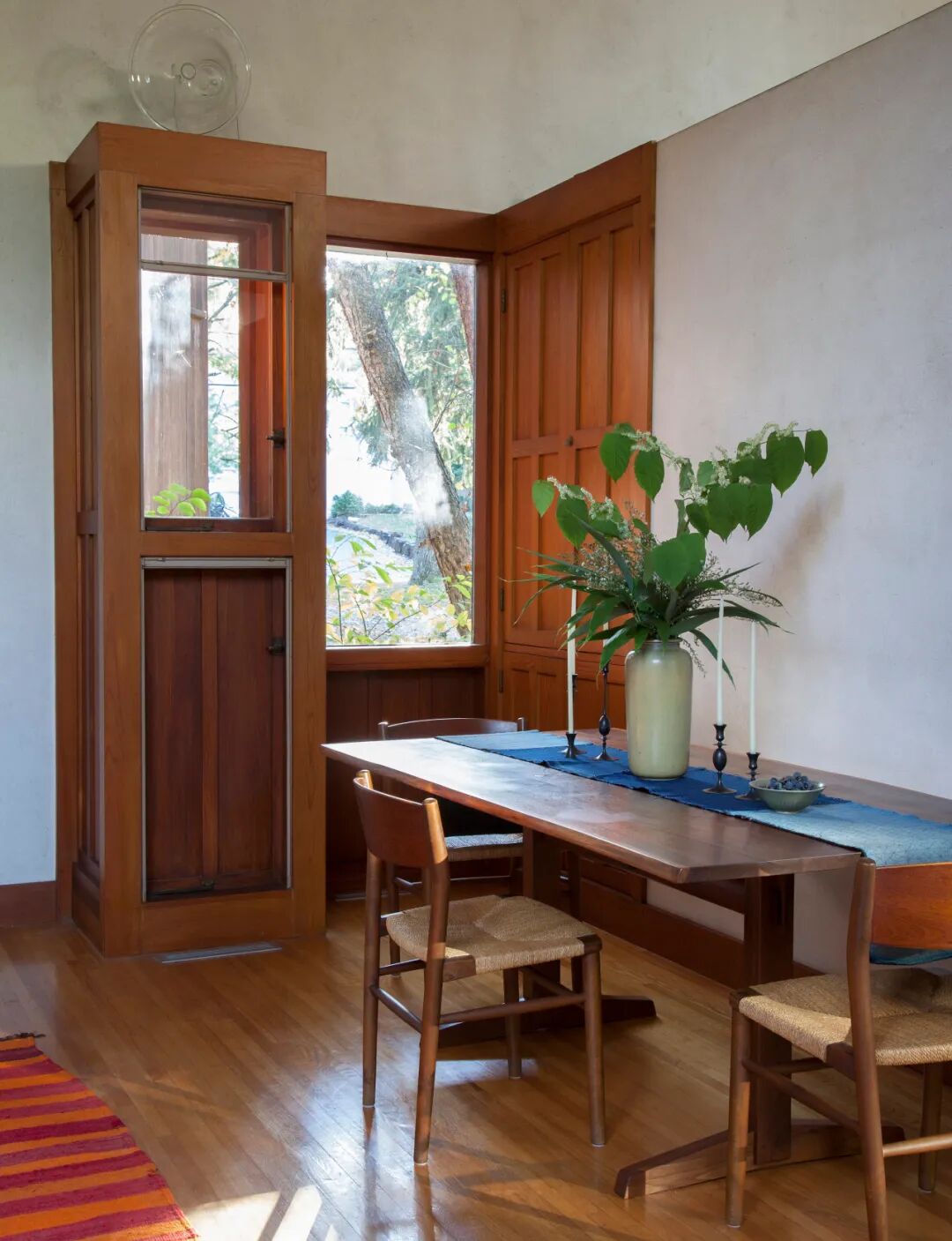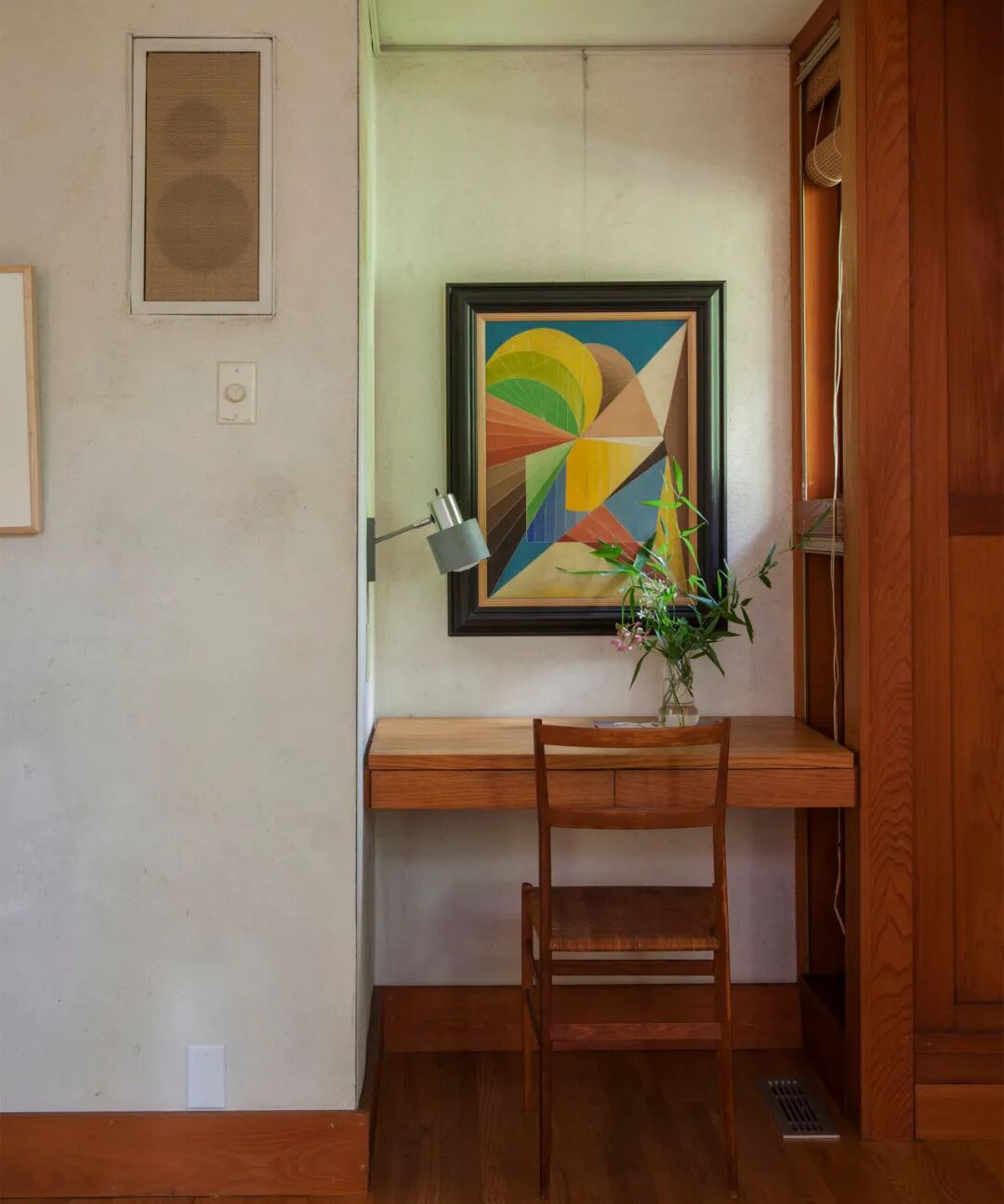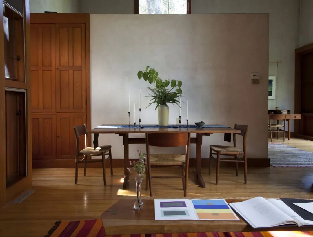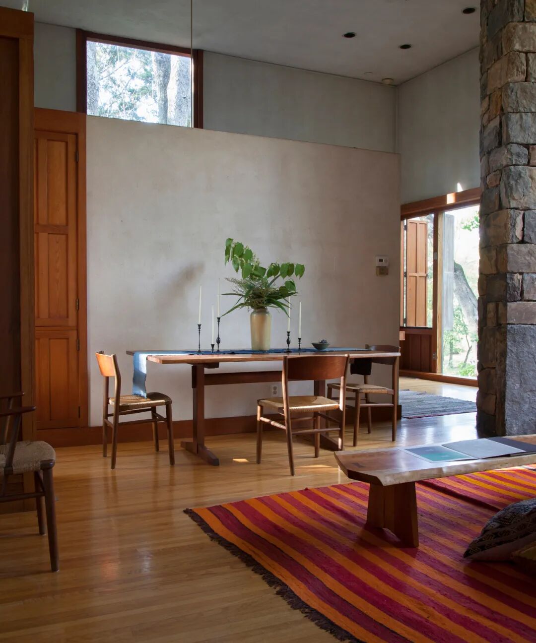 与路易斯·康以往的的混凝土或砖混建筑不同,费舍尔住宅无论是结构还是墙体都选择了木材作为主基调。在看到建筑的第一眼,就会被它那雪松木板建造的外墙所吸引,室内也延续了这种温暖的色调,在家具和装饰上与之相呼应,营造出舒适宜居的空间氛围。