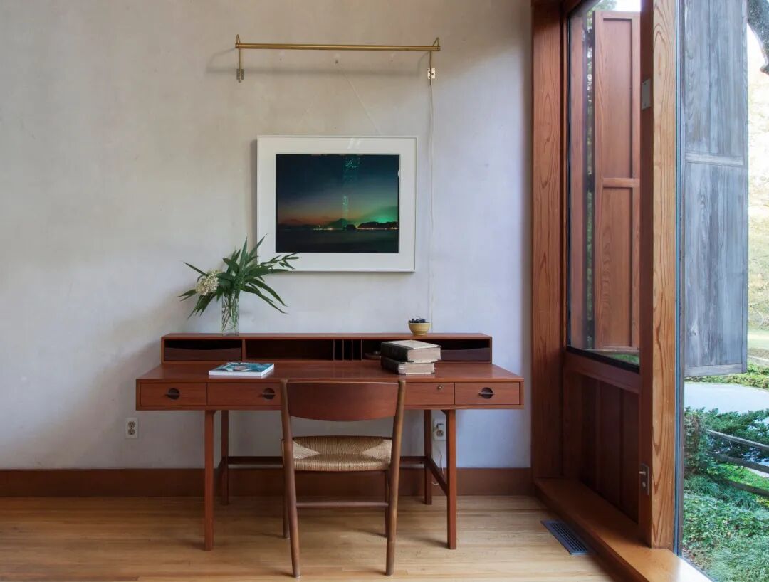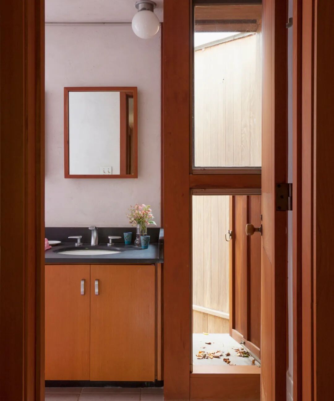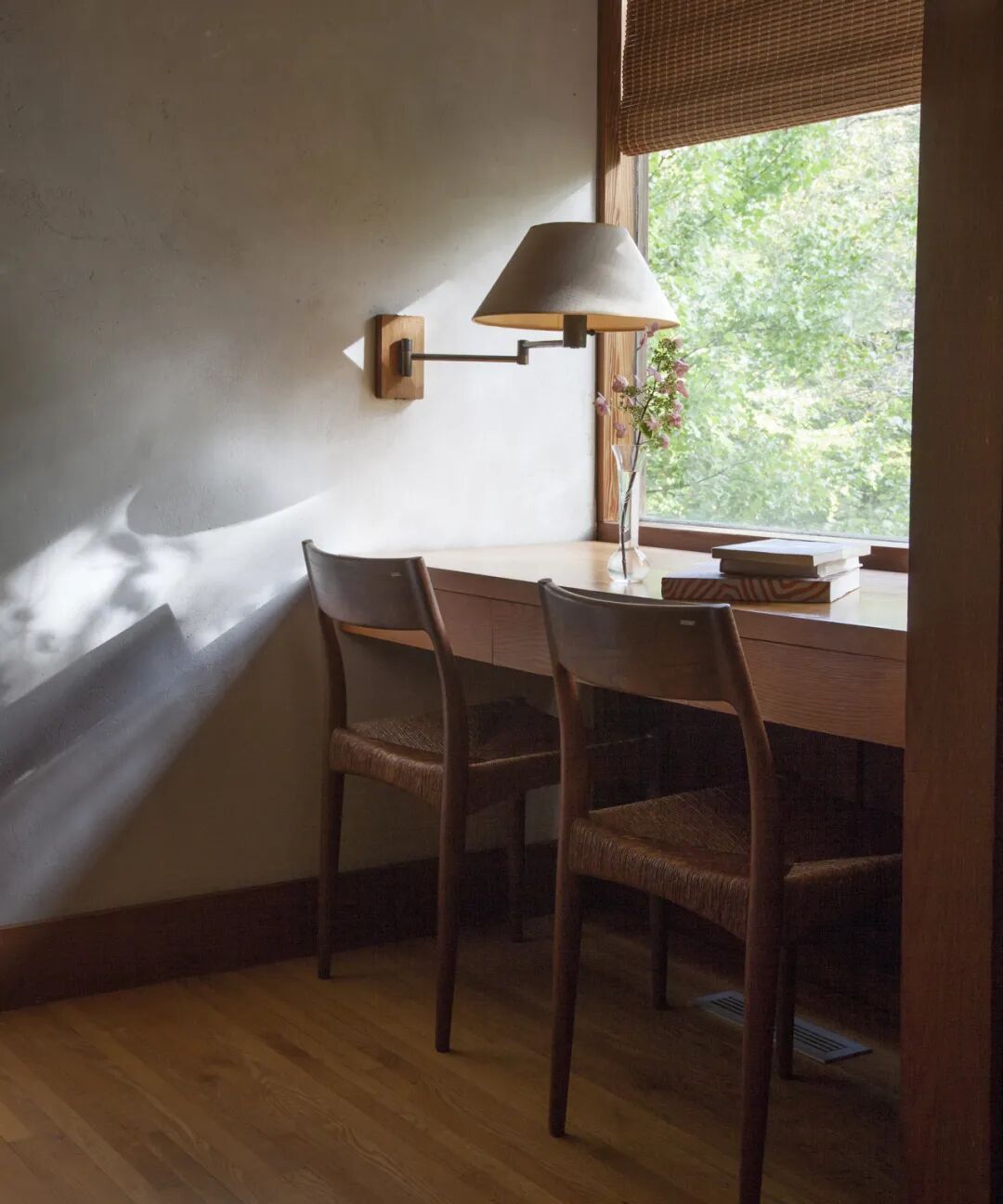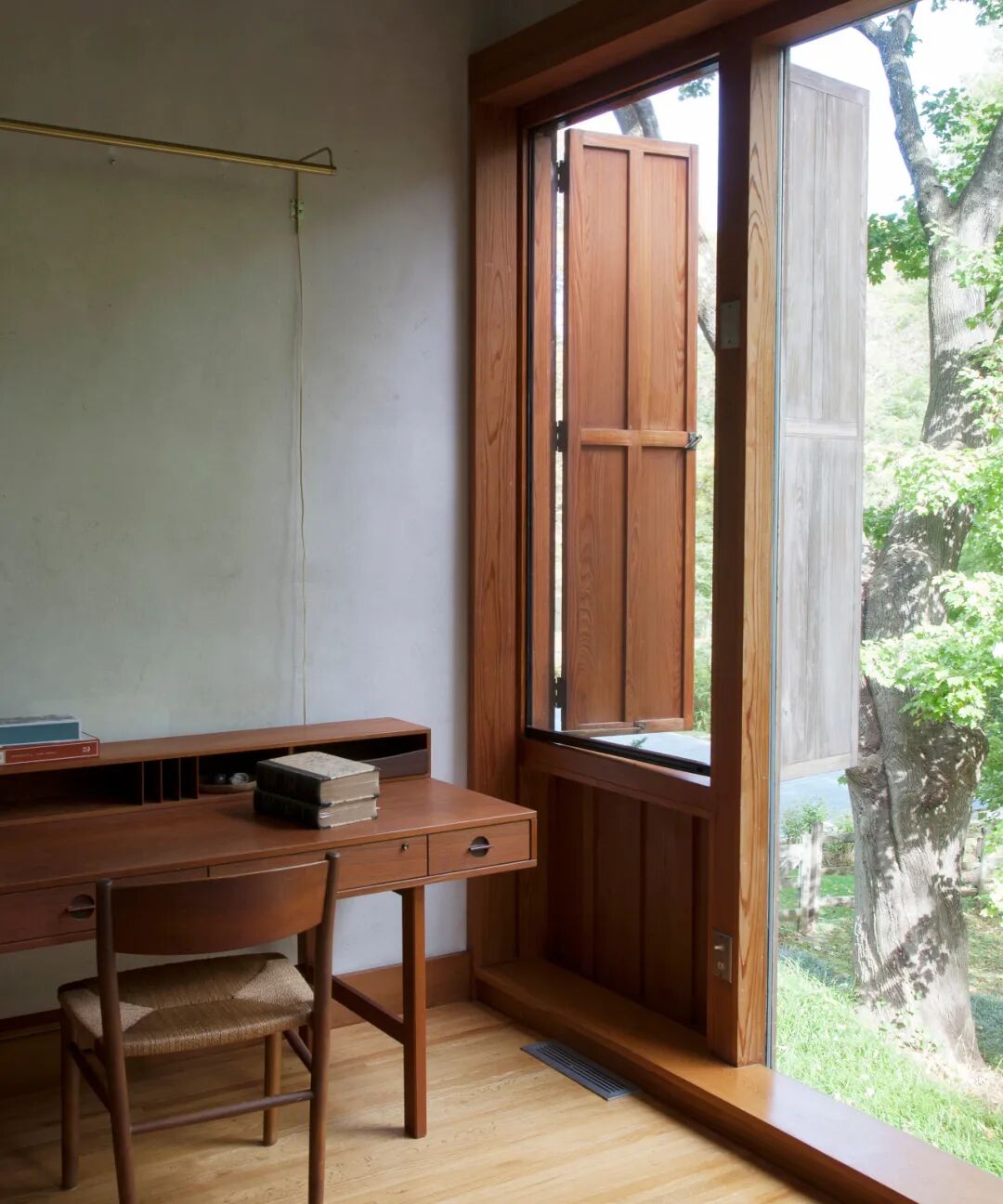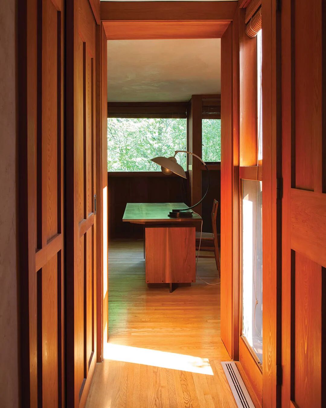 与路易斯·康以往的的混凝土或砖混建筑不同,费舍尔住宅无论是结构还是墙体都选择了木材作为主基调。在看到建筑的第一眼,就会被它那雪松木板建造的外墙所吸引,室内也延续了这种温暖的色调,在家具和装饰上与之相呼应,营造出舒适宜居的空间氛围。