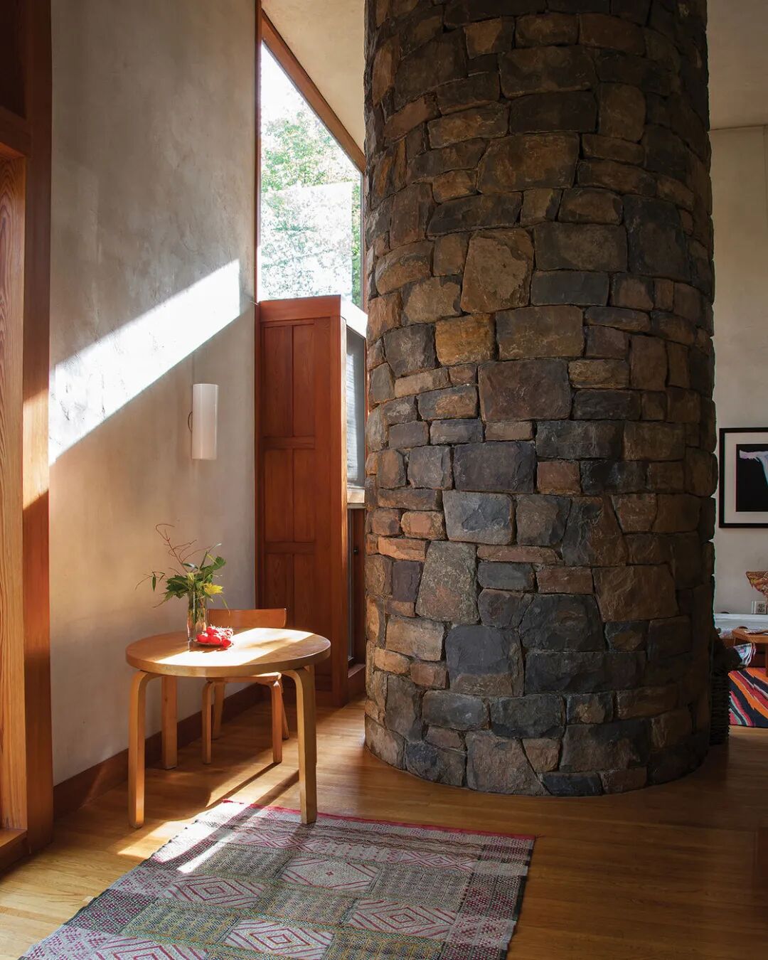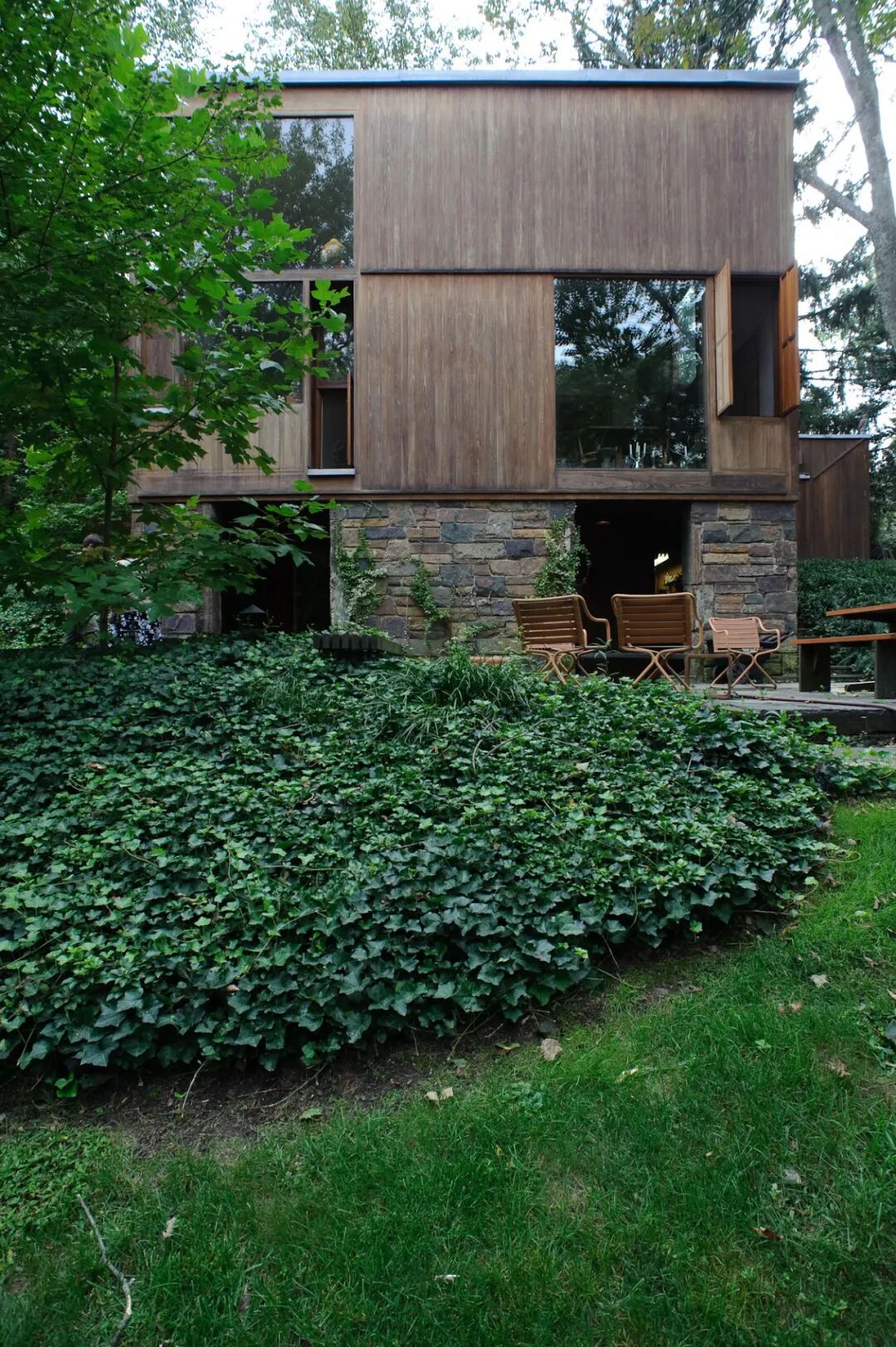 为了适应略带坡度的地形,路易斯·康在住宅的底层加入了石材打造的地基,其表面纹理与木材相辅相成,颇有自然原始的意趣。同时,石材打造的地基能够更好的与周边的花丛植被相结合,防止雨水腐蚀木质的外墙,延长住宅的使用寿命。