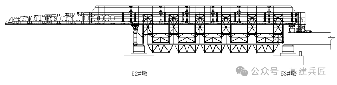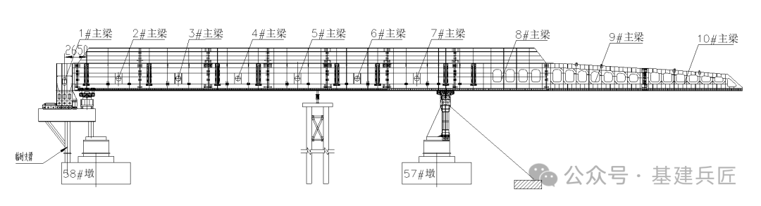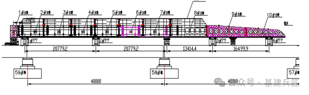 移动模架拼装完成后,从北江中心岛58#墩开始施工到52#墩这6孔40m简支梁之后,需要掉头。考虑52#-51#墩之间为1孔30m预制架设梁, 50#-56#墩跨位于北江副航道,为掉头吊装作业的方便,所以在掉头之前,先把移动模架退回至中心岛57#-59#墩之间梁面上。